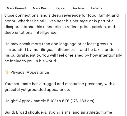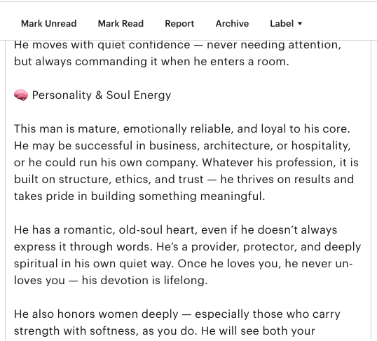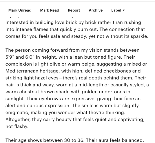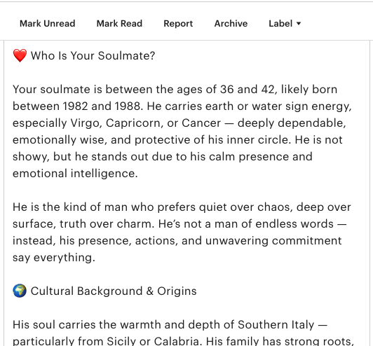 Two psychics independently described my “soulmate” as having olive skin, hazel eyes, and Italian or Mediterranean heritage—a man grounded in tradition and family. One specified Sicily or Calabria; the others stayed broad with phrases like “mixed or Mediterranean heritage” or “a culture where loyalty and shared beliefs matter.”