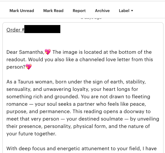 They say you can’t plan love, but I scheduled mine to arrive within 24 hours, which was a promised timeline in many of the listings. I guess a lot of people get anxious when they don’t receive their true-love prophecy as quickly as an Amazon Prime order, but I wasn’t pressed. Two came via Etsy DMs and one as a digital download. I now strongly recommend other psychic’s adopt the digital download since it prevents accidental deletion. I screenshot everything anyway, compiling the results into a spreadsheet so my friends and I could cross-reference details like it was a mystical science fair project.